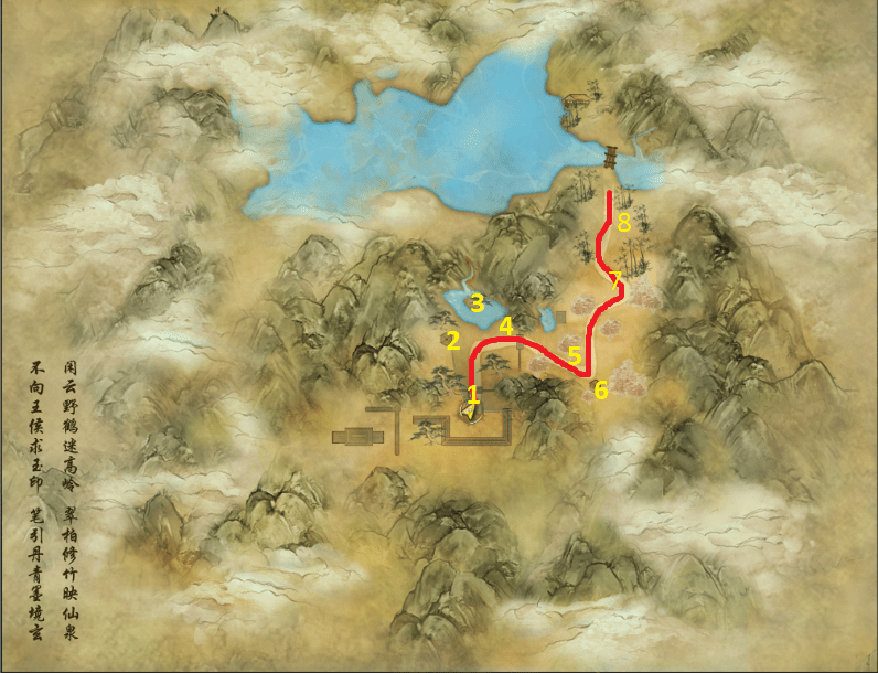 - Hay đi theo đường chính ( màu đỏ ) và nói chuyện với các pet sau đây [Hồng Thọ/Hồng Phúc kim long (thủ vệ)], [Bất Nhị], [Đại Hôi], [Đại Bạch], [Tiểu Hoa], [Ngâm Phong], [Linh Tâm], [Bạch Vũ], [Giải thắng]