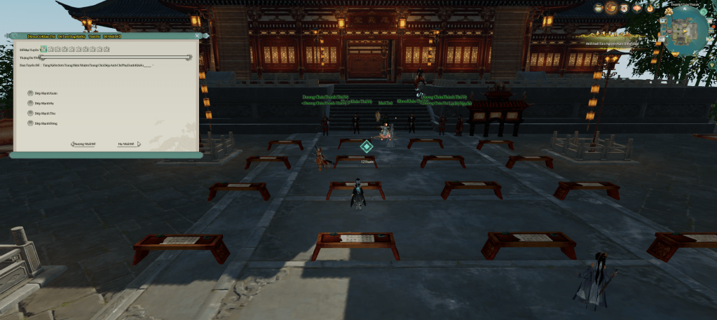 Giao sách xong quay về đối thoại với BPLTS, tiên sinh yêu cầu bạn hoàn thành 1 lần thi. Bạn đến khu thi cử để bắt đầu thi.