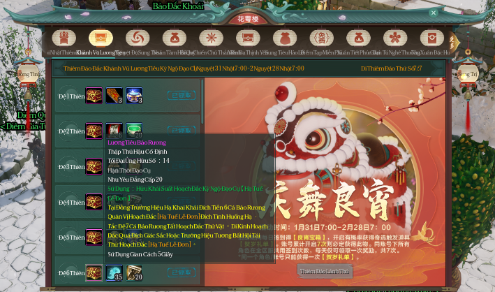 Điểm danh trên Vận Danh Hoạt Động (lồng đèn) nhận được vật phẩm Hạ Tuế Lễ Đơn [贺岁礼单]. Sử dụng sẽ kích được kỳ ngộ.